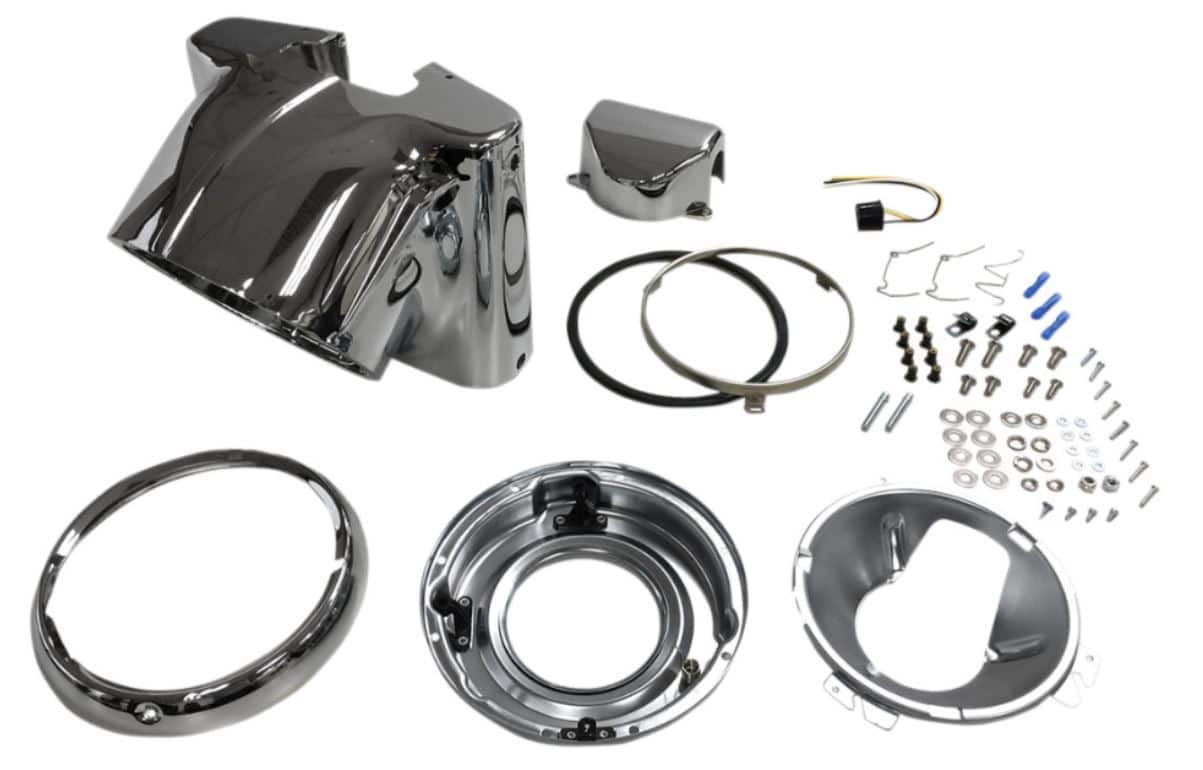 - Handlebar clamp cover, headlight mount, trim ring and all other necessary parts and hardware included for a complete installation